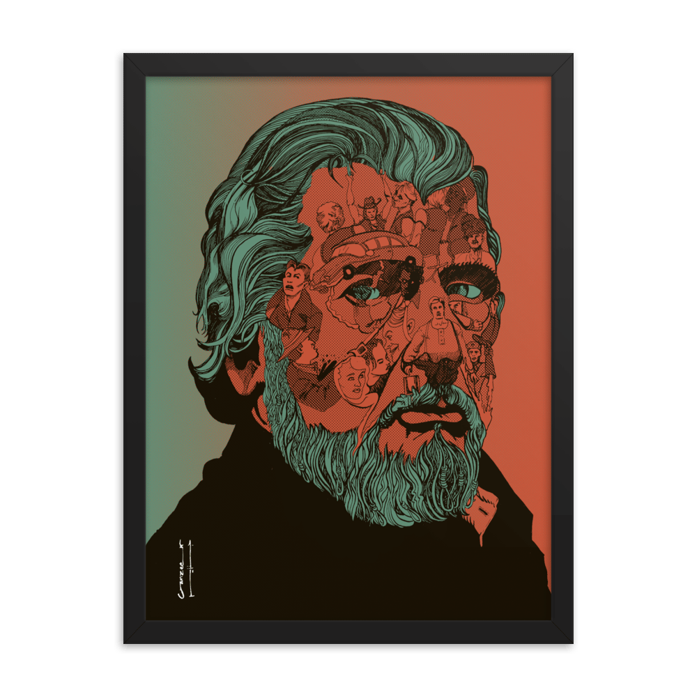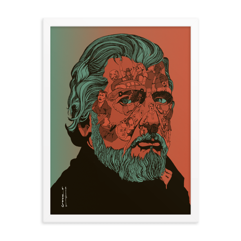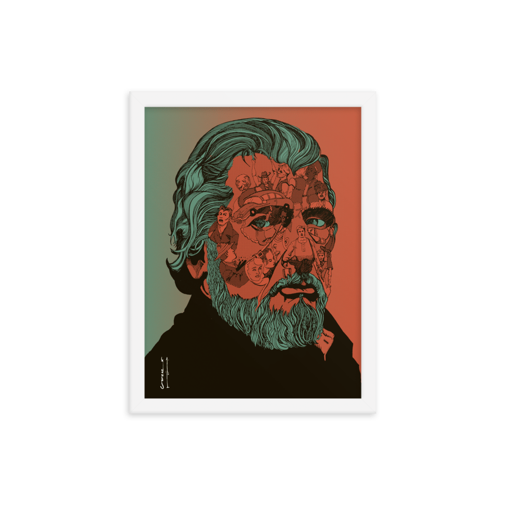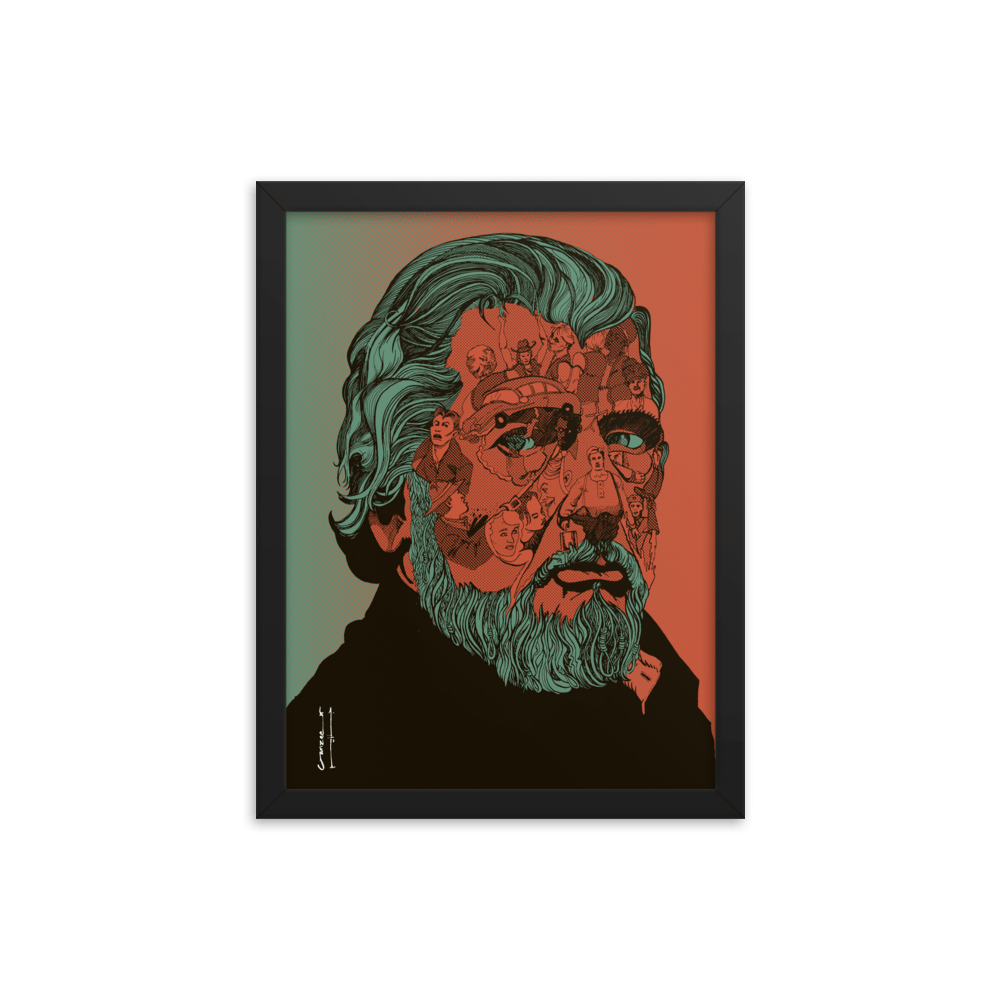 Pre-framed poster featuring the cover-art by Ganzeer for the book on Walter Hill written by Walter Chaw. The portrait is made up of key scenes from a number of the director's unforgettable filmography.